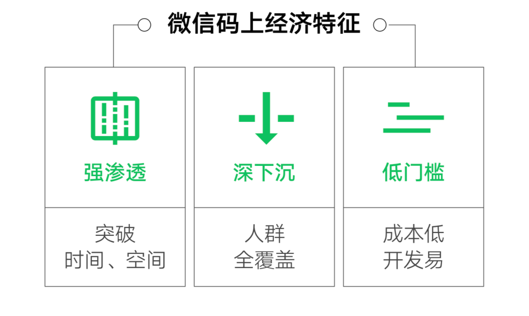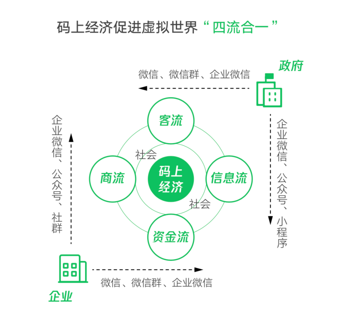 码上经济通过微信生态的公众号、小程序、微信支付、企业微信等二维码载体,构建人、物、场泛在的数字化连接,实现现实世界与虚拟世界的映射,降低防疫中的搜索成本、传输成本、复制成本和跟踪成本,引导社会资源优化配置,保障疫情下信息流、客流、商流、资金流的顺畅流通与融合发展,是疫情中政府治理、企业运营、社会服务、个人生活的有力支撑: