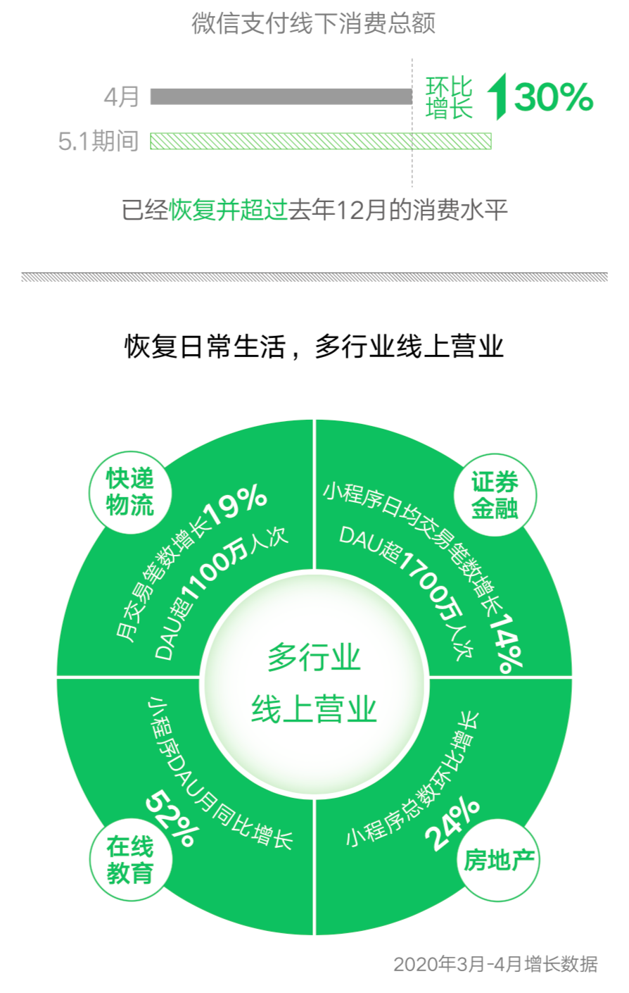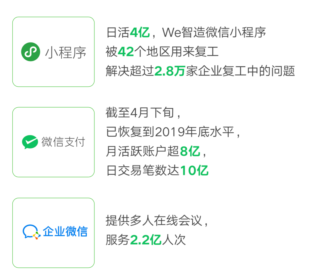 微信生态为疫情下在线医疗、在线教育、在线办公等新业态搭建平台,助推疫情下“无接触”业态的普及,既落实疫情下“少接触、少聚集”的防控精神,也解决了社会正常运转的基本需求。