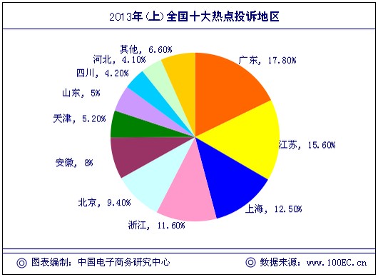 据报告对电子商务投诉的用户所在地区统计显示,2013年(上)电子商务用户投诉热点地区分别为:广东占17.80%,江苏占15.60%,上海占12.50%,浙江占11.60%,北京占9.40%,安徽占8.00%,天津占5.20%,山东占5.00%,四川占4.20%,河北占4.10%,其他占6.60%。