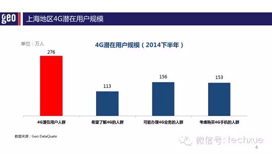 通过网民对4G业务的浏览与搜索等行为的分析,预计上海地区半年内4G的潜在用户规模将达到276万人,其中可能办理4G业务的156万,考虑购买4G手机的153万。备注:关键词搜索热度按照4G相关关键词搜索次数降序排列。