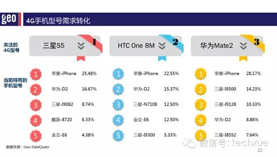 从关注4G用户当前持有手机看,从一线的苹果、三星到千元智能机跨度较广,也预示着4G终端的“泛”概念。这与目前三家运营商“大面积撒网,重点捕鱼”的终端政策不谋而合。