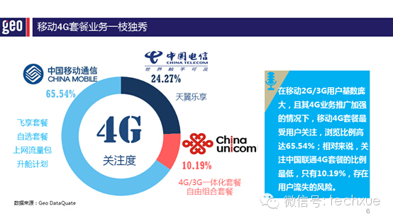 中国移动65.54%的关注度,包含了诸多内容:按照全国近8亿的用户体量,这样的占比不足为奇,但相对于3G时代移动在多地新增份额远低于50%的窘境,这样的占比仿佛又预示着4G时代的“变天”。总之,4G时代已经“抢跑”的大象,最终能否将优势轻易地带到终点,我们将疑问交给市场作答。