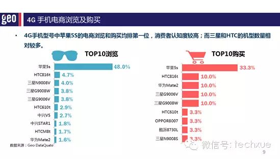 从网民的电商行为上看,4G手机型号中苹果5S的电商浏览和购买均排第一位,其消费者认知度较高;而三星和HTC的机型数量相对较多。