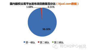 根据IT桔子的不完全数据统计显示,第一梯队的三家平台共计发布48394个项目,占到总体的98%,获得融资的项目为274个,占到总体获投项目的83.7%,融资金额13.2亿元,占到总体的85.4%。