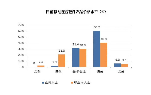 这一现象可能与业内人士对移动医疗硬件成本及应用功能相对比较了解,因此对其价格水平期望值相对比较低。