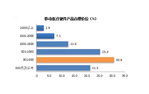 数据显示,30.8%受访者认为移动医疗硬件产品合理价位是301-500元人民币,,25.3%认为合理价位是501-1000元人民币,21.3%认为合理价位是300元以内,12.6%认为合理价位是1001-1500元人民币。总的来说,千元以内是中国消费者对移动医疗硬件产品价格的承受范围。