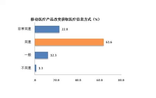 数据显示,63.6%的受访者同意移动医疗将改变人们对医疗信息的获取方式,22.8%的受访者非常同意移动医疗将改变人们对医疗信息的获取方式。
