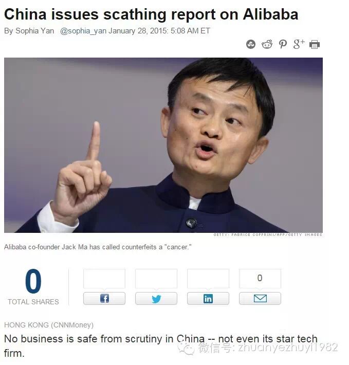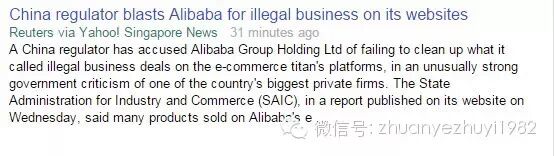 报道指出,美国等方面此前曾指责阿里巴巴容许赝品销售(sales of counterfeit goods ),但中方发布周三这种批评报告尚属首次,且目标是国家高层非常看好的一家领跑的互联网明星企业(a leading star in an Internet industry)。