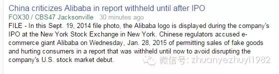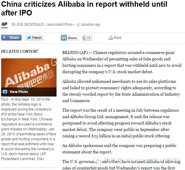 首先是美联社《China criticizes Alibaba in report withheld until after IPO》,标题把新闻点放在“中方扣留了涉及阿里巴巴的假货报告(即白皮书),直到它在美国IPO成功后才公开”。