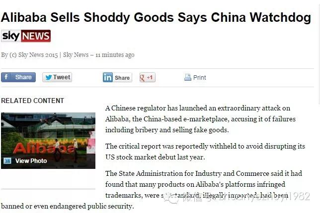 ↑再来看看英国天空电视台官网的报道《Alibaba Sells Shoddy Goods Says China Watchdog》,Shoddy Goods是假冒伪劣产品的意思。