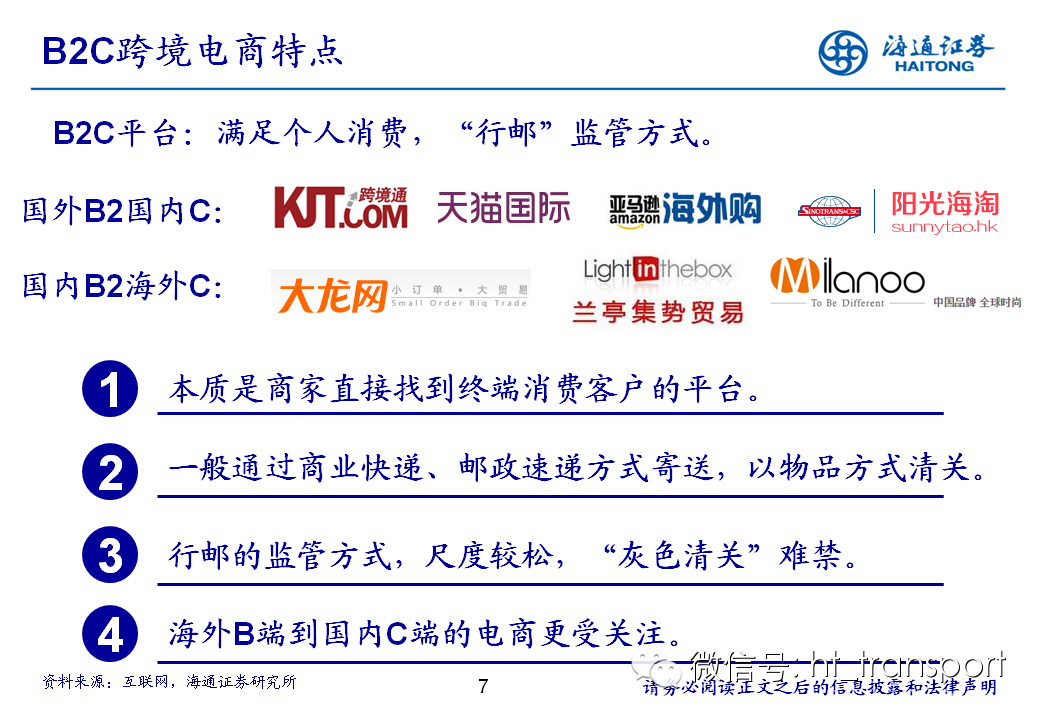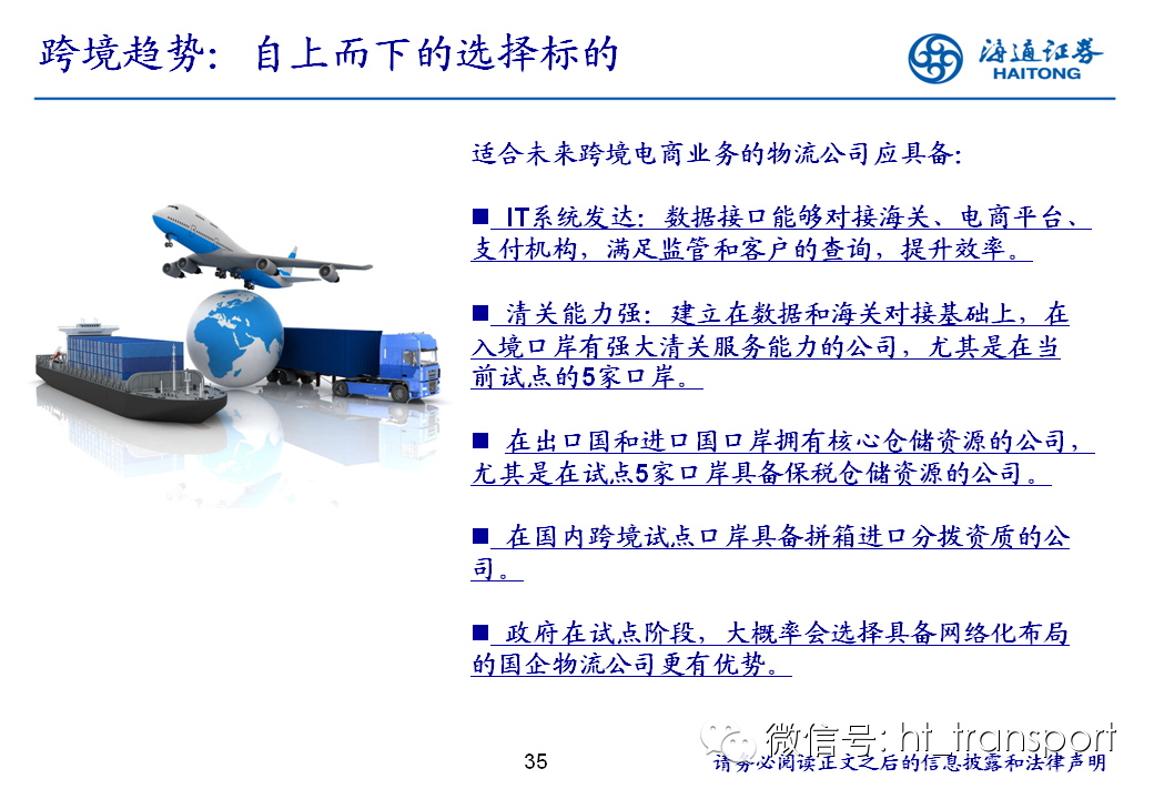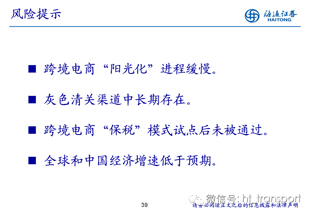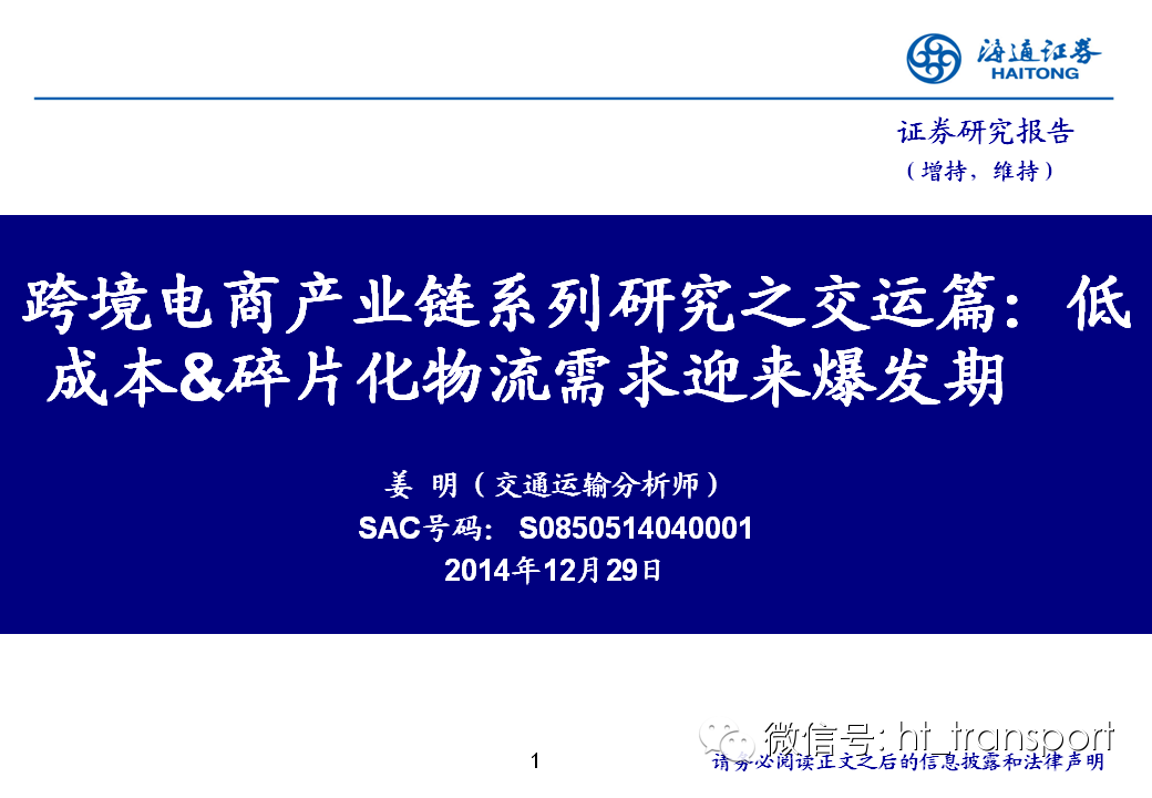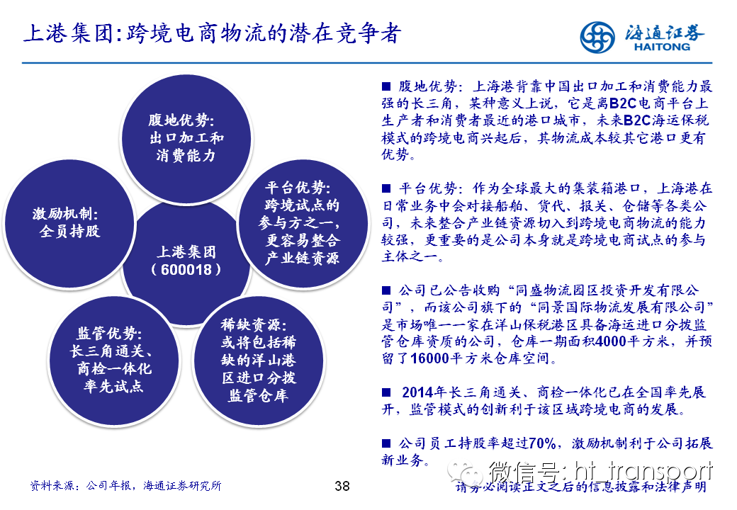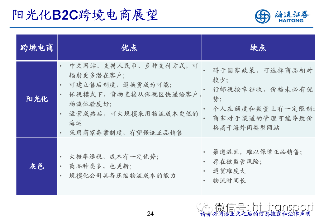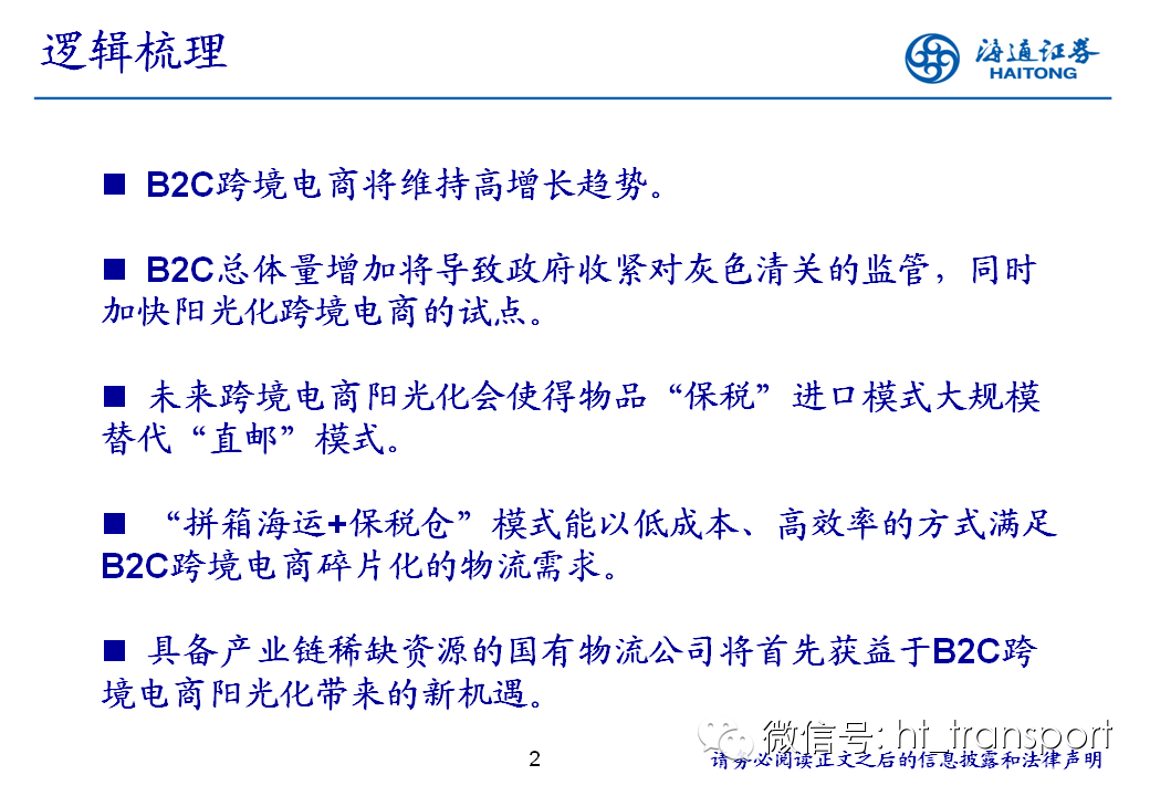 随着互联网消费渗透率、民众消费能力的不断提升,预计2014年中国B2C进口跨境电商市场环比翻番至1550亿元(2013年为767亿元),并有望在2018年达到1万亿产值,传统灰色清关模式弊端逐步显露,一方面消费者权益无法保障,同时政府大量应征行邮税逃逸,未来政府大概率会收紧对灰色清关的监管,同时加快推进阳光化跨境电商试点。预计跨境电商阳光化后,“保税进口模式”(货物先按一般贸易申报进口至保税区,根据电商实际订单从保税区按行邮方式清关快递至消费者)有望大规模替代当前的“直邮清关模式”(海外商家直接通过快递、邮件将商品发给国内消费者),其中“拼箱海运+保税仓”模式能以低成本、高效率的方式满足B2C跨境电商碎片化的物流需求,将会伴随跨境电商市场的发展迎来爆发性增长,推荐具备口岸清关、进口分拨、保税仓库等稀缺资源的三个标的:外运发展(600270.SH)、华贸物流(603128.SH)和上港集团(600018.SH)。