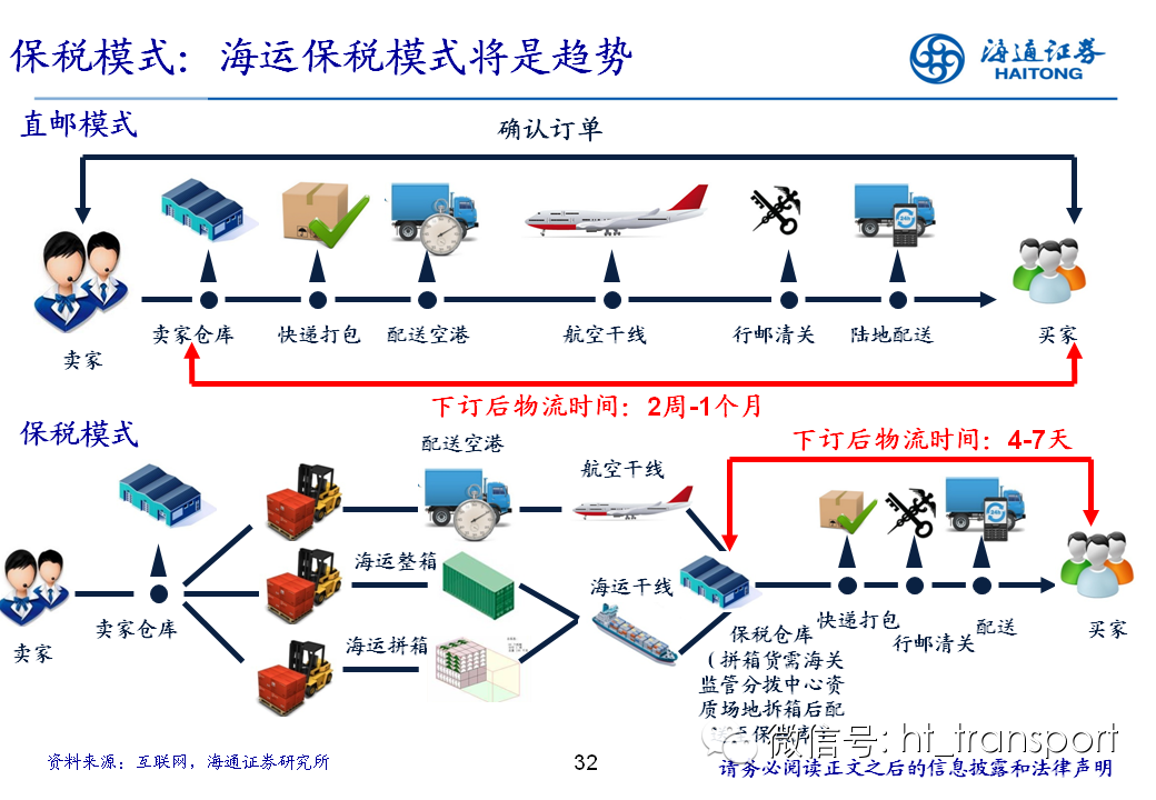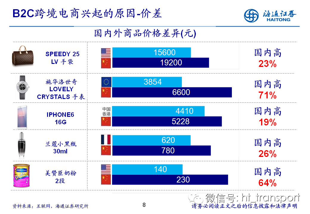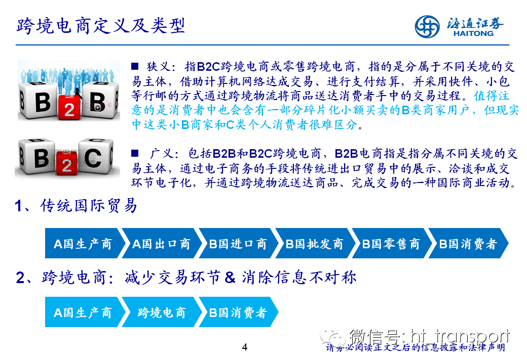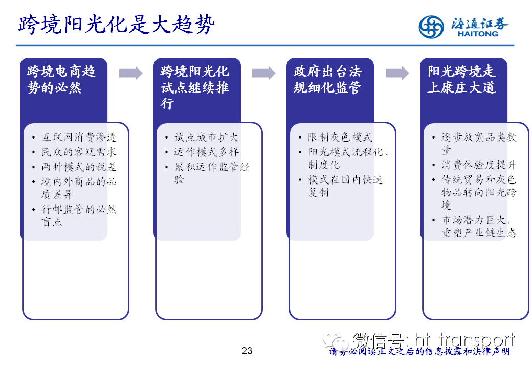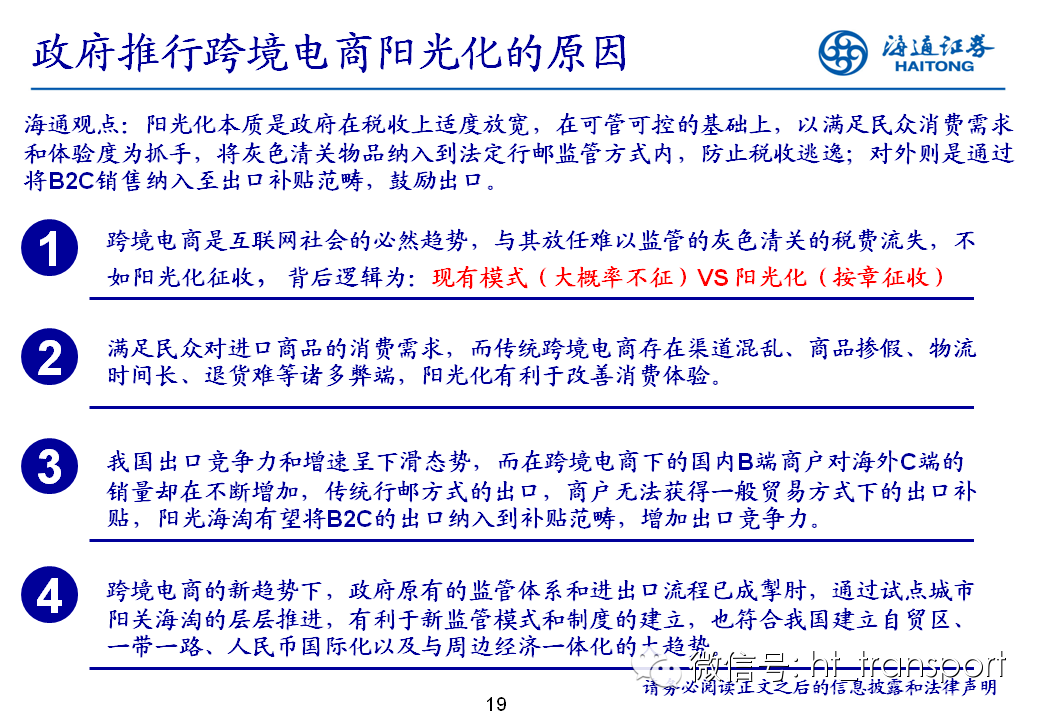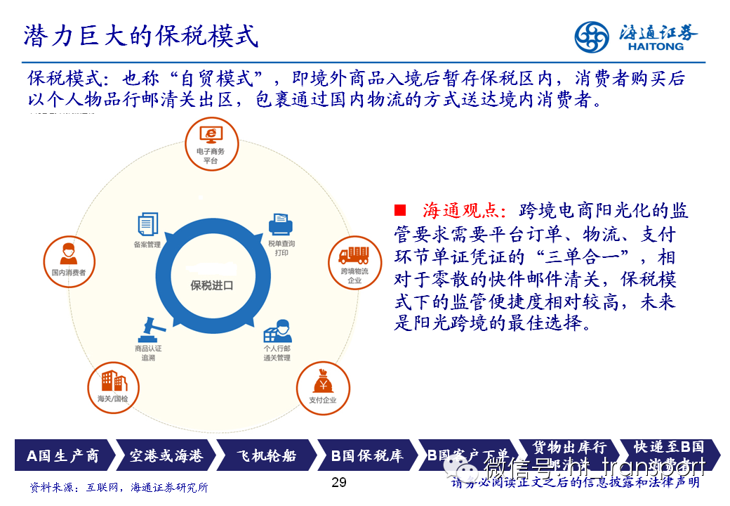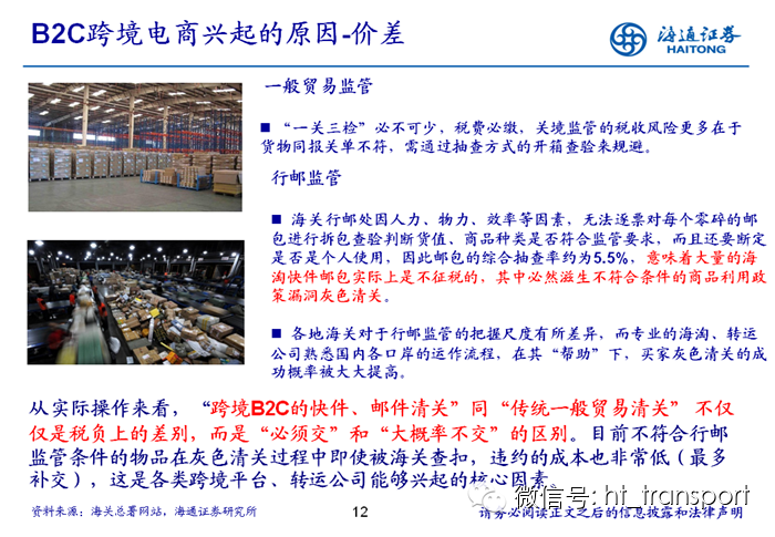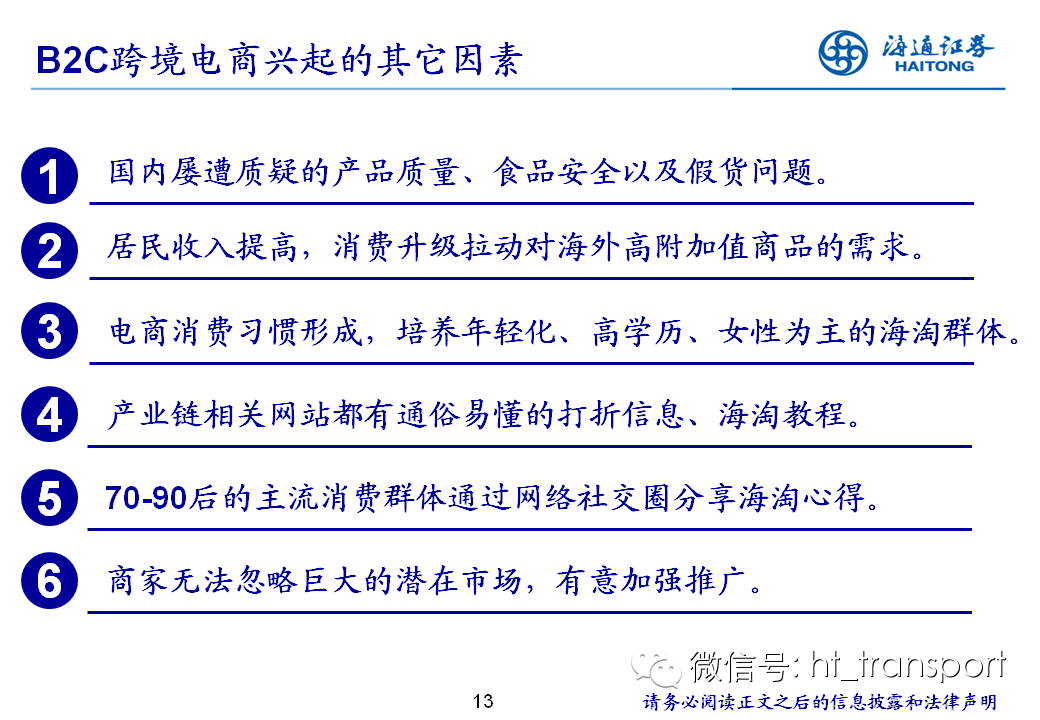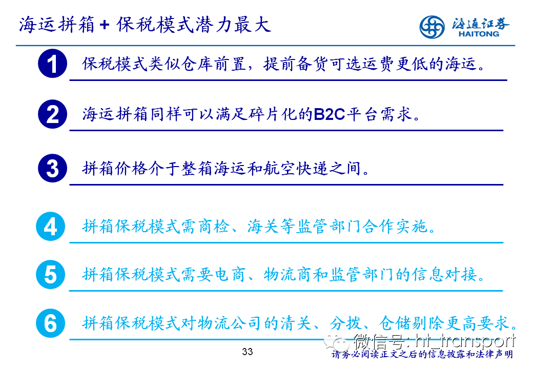 随着互联网消费渗透率、民众消费能力的不断提升,预计2014年中国B2C进口跨境电商市场环比翻番至1550亿元(2013年为767亿元),并有望在2018年达到1万亿产值,传统灰色清关模式弊端逐步显露,一方面消费者权益无法保障,同时政府大量应征行邮税逃逸,未来政府大概率会收紧对灰色清关的监管,同时加快推进阳光化跨境电商试点。预计跨境电商阳光化后,“保税进口模式”(货物先按一般贸易申报进口至保税区,根据电商实际订单从保税区按行邮方式清关快递至消费者)有望大规模替代当前的“直邮清关模式”(海外商家直接通过快递、邮件将商品发给国内消费者),其中“拼箱海运+保税仓”模式能以低成本、高效率的方式满足B2C跨境电商碎片化的物流需求,将会伴随跨境电商市场的发展迎来爆发性增长,推荐具备口岸清关、进口分拨、保税仓库等稀缺资源的三个标的:外运发展(600270.SH)、华贸物流(603128.SH)和上港集团(600018.SH)。