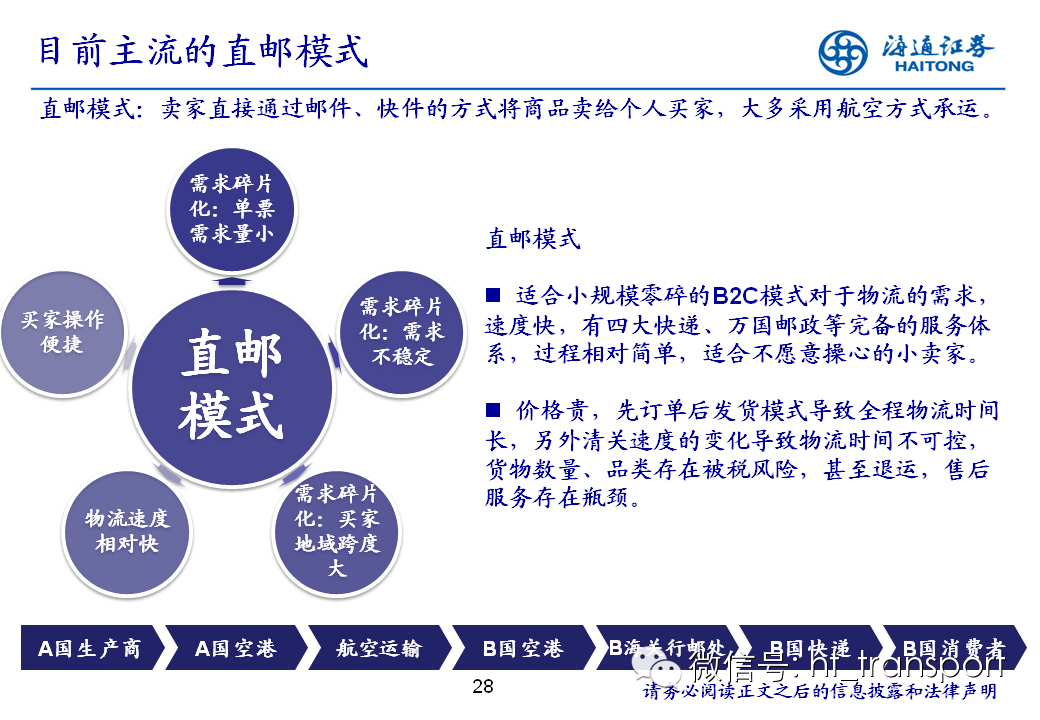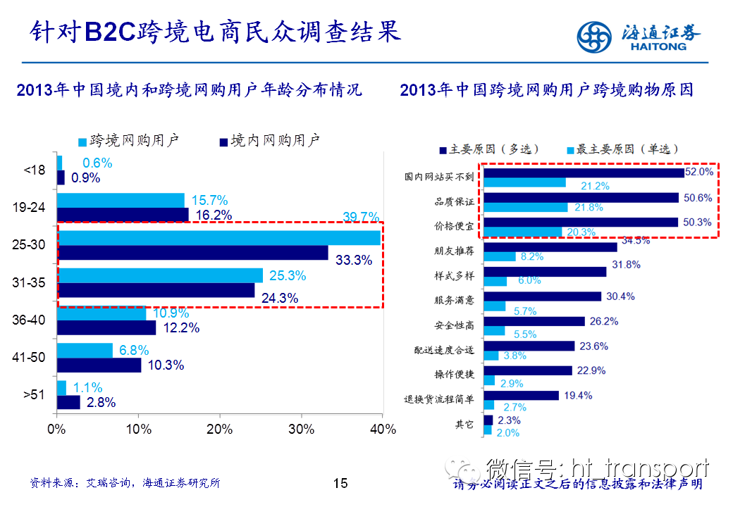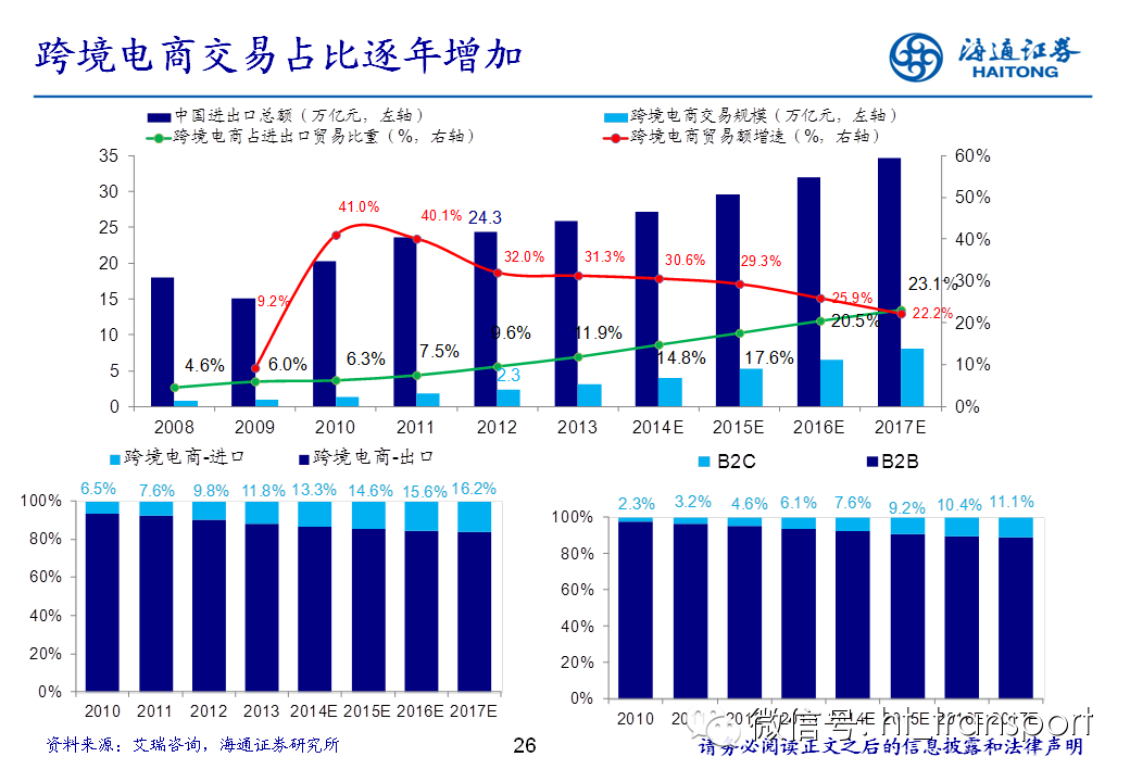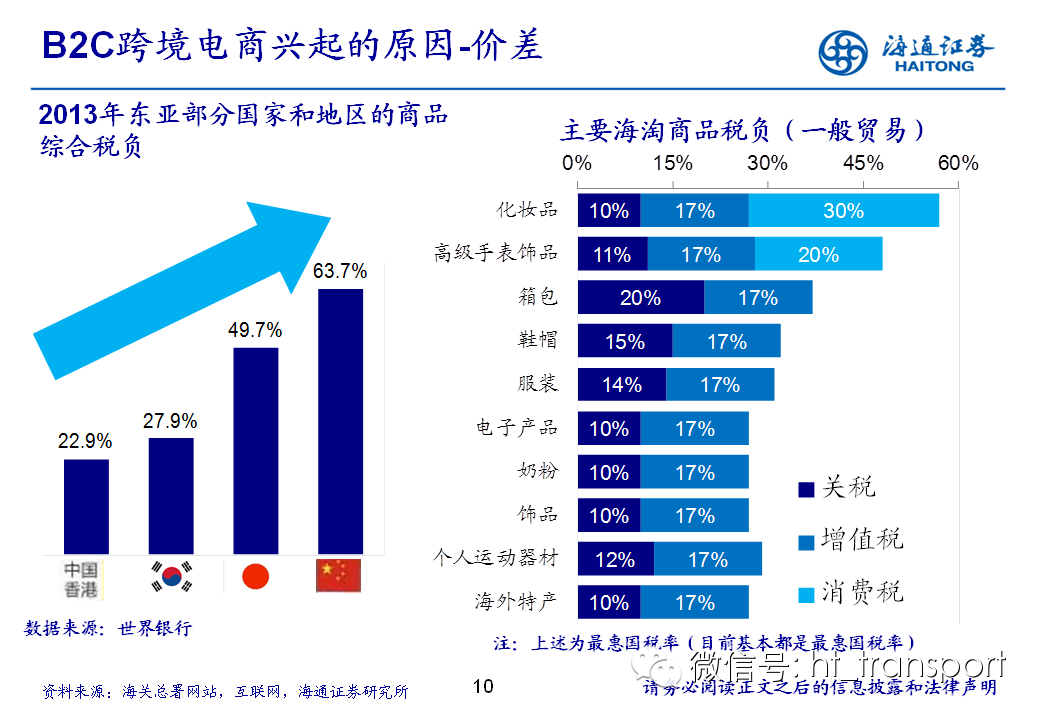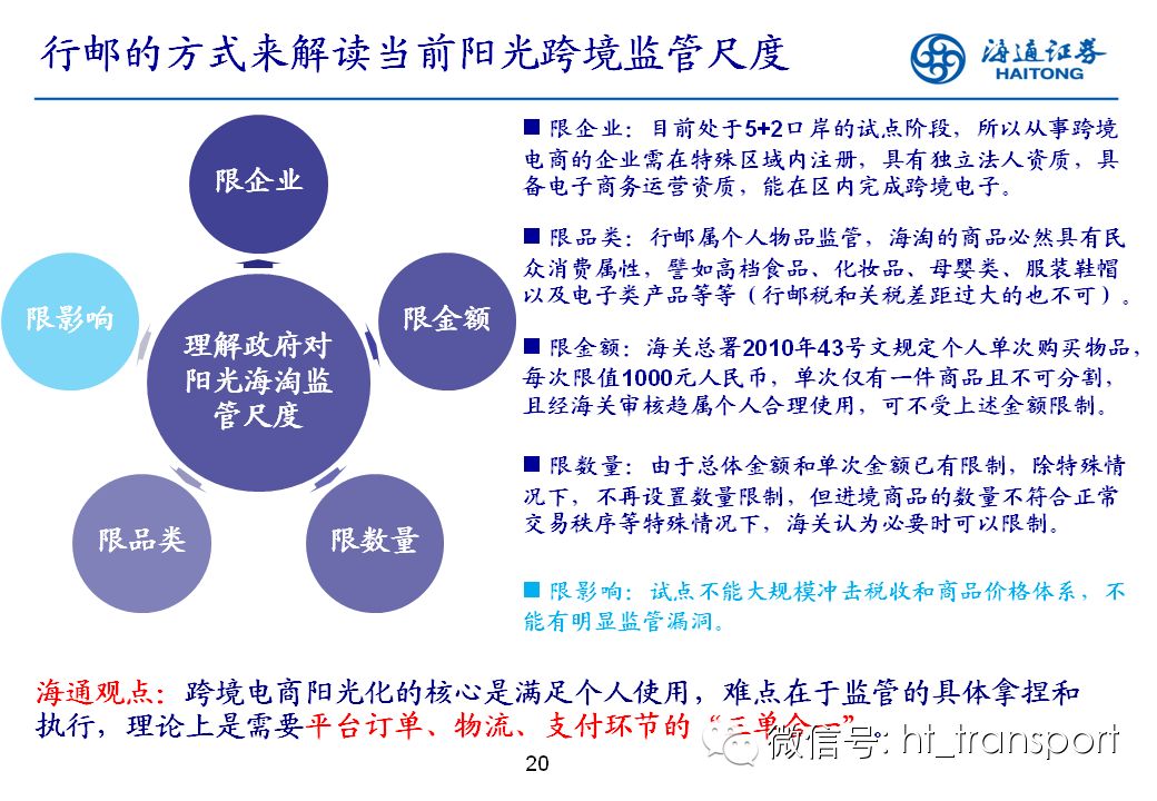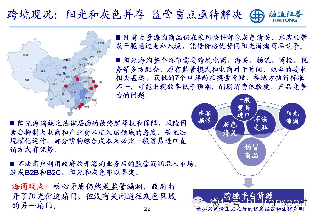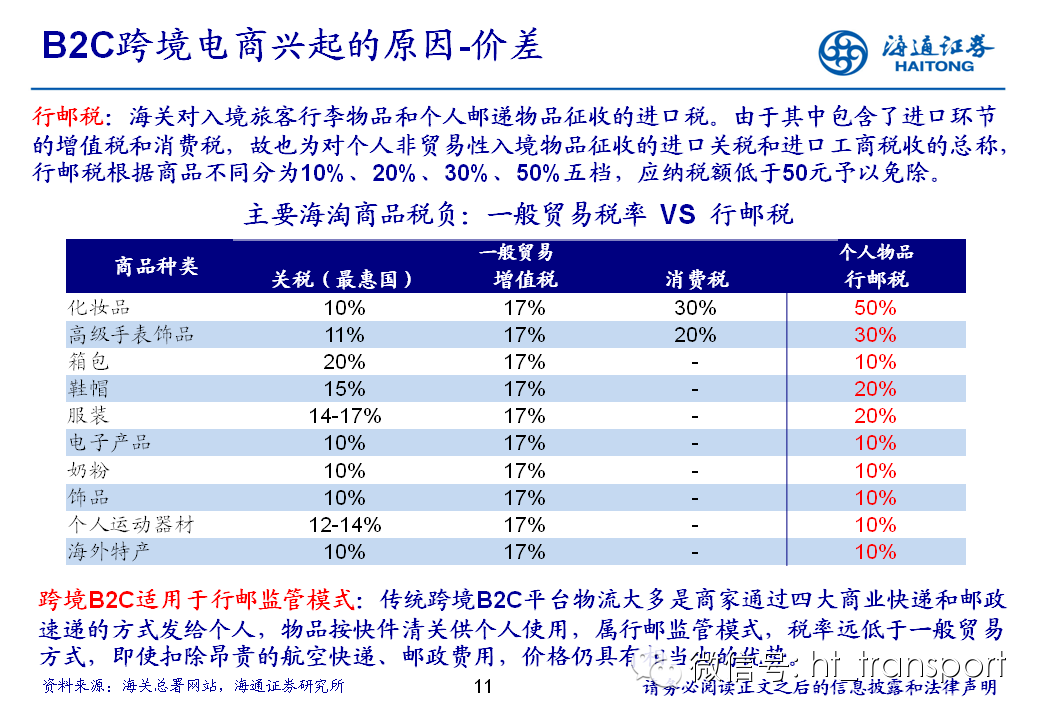 随着互联网消费渗透率、民众消费能力的不断提升,预计2014年中国B2C进口跨境电商市场环比翻番至1550亿元(2013年为767亿元),并有望在2018年达到1万亿产值,传统灰色清关模式弊端逐步显露,一方面消费者权益无法保障,同时政府大量应征行邮税逃逸,未来政府大概率会收紧对灰色清关的监管,同时加快推进阳光化跨境电商试点。预计跨境电商阳光化后,“保税进口模式”(货物先按一般贸易申报进口至保税区,根据电商实际订单从保税区按行邮方式清关快递至消费者)有望大规模替代当前的“直邮清关模式”(海外商家直接通过快递、邮件将商品发给国内消费者),其中“拼箱海运+保税仓”模式能以低成本、高效率的方式满足B2C跨境电商碎片化的物流需求,将会伴随跨境电商市场的发展迎来爆发性增长,推荐具备口岸清关、进口分拨、保税仓库等稀缺资源的三个标的:外运发展(600270.SH)、华贸物流(603128.SH)和上港集团(600018.SH)。