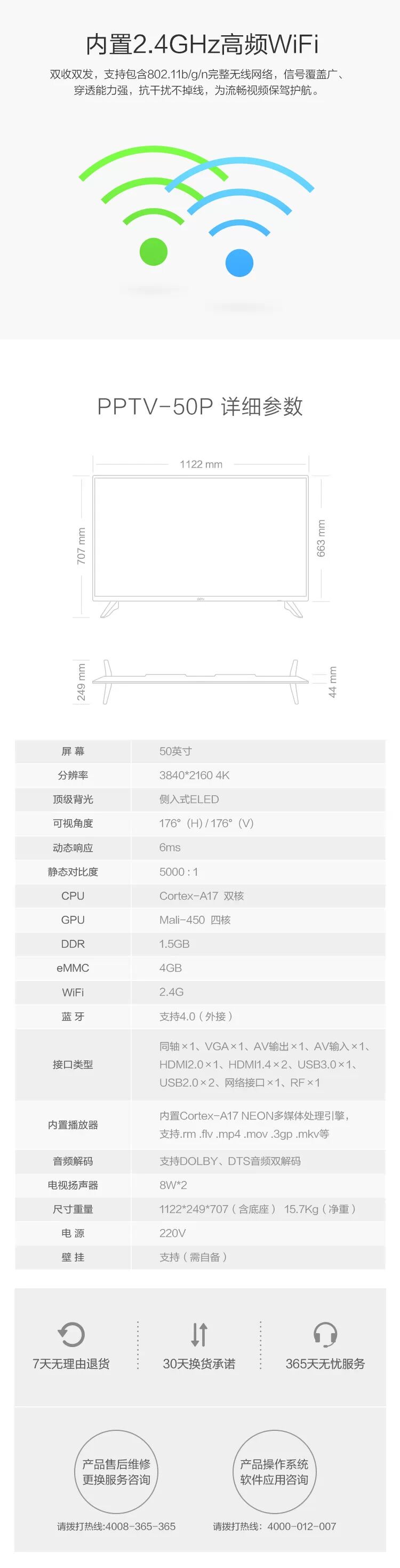 从PPTV-50P的参数上来看,4K及多核智能处理器成最大亮点,采用侧入式ELED使得该款50吋电视不但保持了5000:1的静态对比度,超薄的机身设计对于家庭用户来说也更容易和家庭装潢融为一体。显然作为常年与用户打交道的品牌,深谙用户需求的重要性。另外值得一提的是,该款电视配置有3个HDMI接口,3个USB接口和1个SD读卡器,对于有海量片库的朋友来说,真是贴心的设计啊。