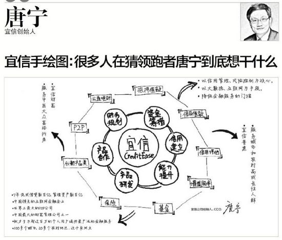 宜信公司由唐宁创建于2006年,总部位于北京,是一家集财富管理、信用风险评估与管理、信用数据整合服务、小额贷款行业投资、小微借款咨询服务与交易促成、公益理财助农平台服务等业务于一体的综合性现代服务业企业。