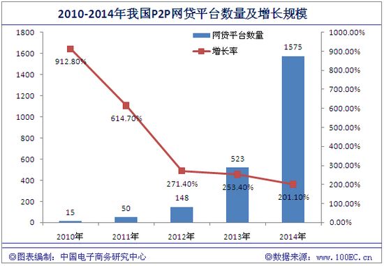 未来15~20年内,以P2P网贷所代表的直接融资模式,将抢占以传统银行为主体的间接融资市场份额。据网经社(100EC.CN)监测数据显示,截止到2014年年底,我国P2P平台全年达到1575家,接近2013年(800家)的两倍;投资人数达到了116万,比上一年(25万)增长了364%,成交量也从2013年的1058亿元增长到了2528亿元。