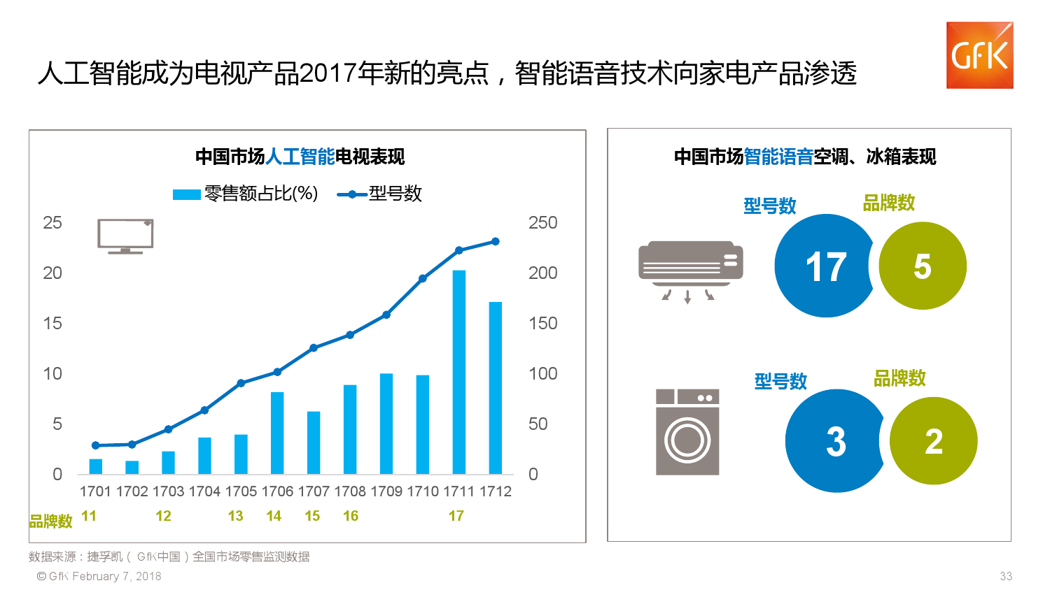 中国电子家电在线渠道新趋势本质上来看就是产品结构优化升级,而产品的提升离不开科技的创新。AI的发展为传统厂商、互联网厂商、在线平台、内容提供商创造机遇。2017年人工智能电视得到了快速发展,“双11”期间人工智能电视销售额比重超过了20%,同时作为智能家居入口的智能音箱引爆2017年,市场规模超过150万台。智能家电发展过程中,国产品牌成为绝对主力,GfK数据显示,零售量近3成的智能化空调、冰箱、洗衣机由国产品牌贡献。