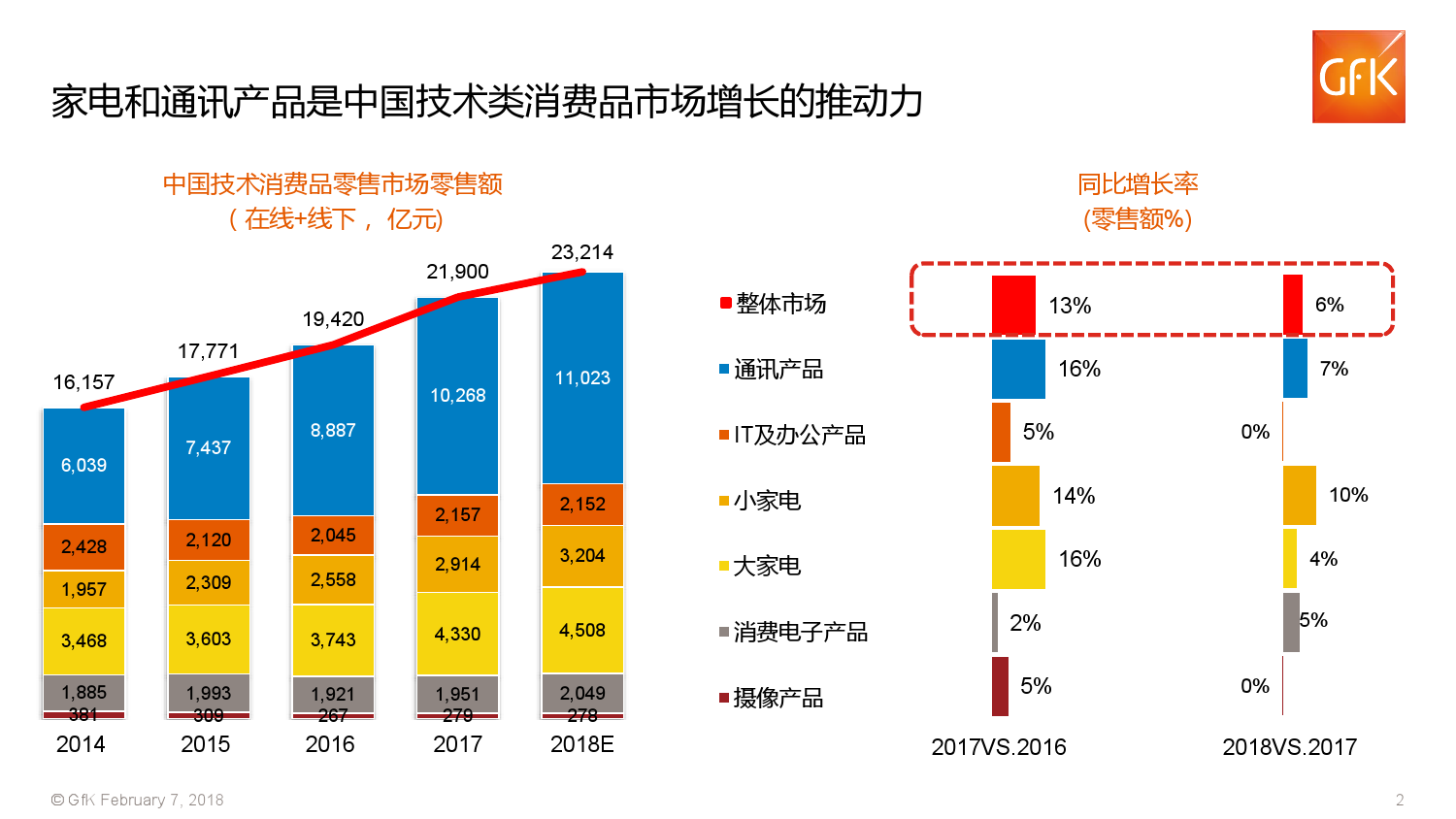 (电子商务研究中心讯) 中国的家电行业正在迎来两大时代机遇:对内是消费品质升级、对外是“一带一路”国家政策机遇。在此契机下,如果说过去3年,还是消费升级的萌芽和培养阶段,那么,未来3-5年则将正式进入消费升级的成长和爆发期。对中国家电产业来说,这其中蕴藏着的消费潜力不可限量。GfK数据显示,2017年中国技术消费品市场零售额达到21900亿元,同比2016年增长13%.从产品角度,家电和通讯产品是中国技术类消费品市场增长的主要推动力。