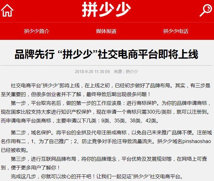 天眼查信息显示,深圳虹新原名深圳沸点娱乐有限公司。在宣布进军社交电商之后,亦未改“娱乐”本色。官网的第一篇报道中,拼少少对创业者进行了一番关于商标保护、域名保护、品牌布局的“教育”,如图所示感受一下: