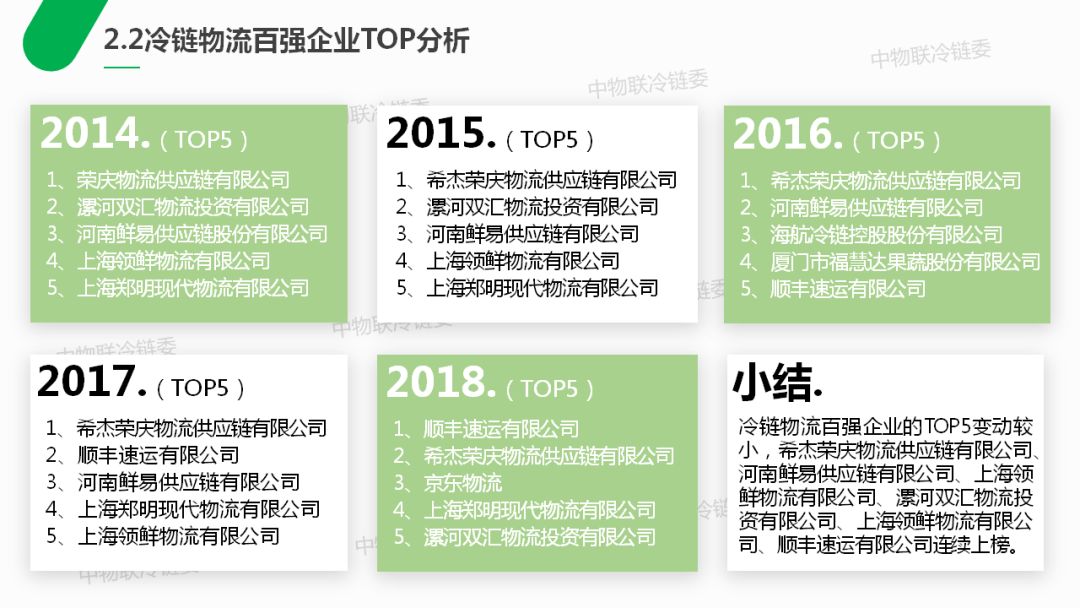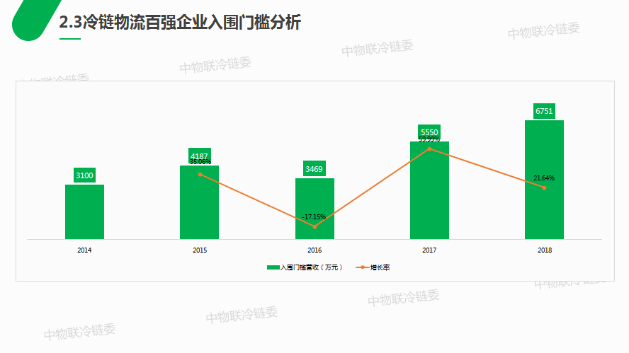 2018年中国冷链物流百强企业中原百强企业有75家,新晋百强企业有25家,新晋百强占原百强的⅓,一方面体现出当前冷链物流行业发展势头良好,不断有新的企业开展冷链物流业务并涌入百强,另一方面体现出冷链物流百强稳定性不高,变动较大,门槛较低。 新晋与跌出冷链物流百强企业分布在各个名次阶段,但主要集中在71-100名较靠后的阶段,表明71-100阶段竞争激烈。百强波动较大的原因主要有: (1)部分企业客户稳定性较弱、黏性较低,受客户流动性影响导致业务量和营收额降低; (2)在技术、设备、模式等不断变革的情况下,部分企业原地踏步甚至退步; (3)2018年经济下行压力较大,部分综合竞争力不强的企业在激烈的行业竞争中受到冲击; (4)国际贸易环境的变化与海关政策的调整,影响了部分港口型、跨境型等企业的发展; (5)部分企业未能按时提交财务报表及审计报告。 整体来说,冷链物流百强企业人员规模较小,2018年在吸纳社会就业方面保持了平稳速度的增长,提供就业岗位数量约7.3万个,同比增长7.35%,人员规模集中在头部,百强企业前15名的员工人数达3.8万人,占到百强企业员工总人数的52.05%,而百强企业16-100名的员工人数为3.5万人。 近5年来冷链业务发展迅速,百强营收规模不断扩大,年复合增长率达21.89%。2018年冷链物流百强企业冷链业务营业收入合计达398.24亿元,同比增长53.27%,增幅突破新高;占2018年冷链物流市场规模的13.79%,百强市场占有率相较于2016年的9.22%、2017的10.19%有明显增加,意味着市场集中度不断提高。 2018年,冷链物流企业前5名的营收达到139.64亿元,占到百强总营收的35%;冷链物流企业前10名的营收达到214.81亿元,占到百强总营收的54%,头部集聚效应明显;冷链物流企业前30名的营收达到314.07亿元,占到百强总营收的79%;冷链物流企业前50名的营收达到349.92亿元,占到百强总营收的88%。冷链物流企业后50名的营收只占到百强总营收的12%,意味着中小企业占据多数,冷链物流行业仍面临散、小、杂的特点。 2018年冷链物流百强企业入围门槛营收为6751万;2017年冷链物流百强企业入围门槛营收为5550万;2016年冷链物流百强企业入围门槛营为收3469万;2015年冷链物流百强企业入围门槛营为收4187万;2014年冷链物流百强企业入围门槛营收为3100万。 冷链物流百强企业入围门槛营收总体呈波动上升趋势,2016年受经济形势影响入围门槛营收有所回落,此后1年迅速回升,2018年增速降缓实现稳步增长,表明冷链物流企业竞争越来越激烈,同时整体冷链物流企业不断发展壮大。 按区域入围企业数量排序:华东>华北>华中>华南>东北>西南>西北,华东入围企业数量最多。 按区域百强企业营收排序:华东>华南>华北>华中>西南>东北>西北,华东入围企业总营收最高。 按区域百强营收均值排序:华南>华东>华中>华北>西南>东北>西北,华南入围企业平均营收最高。 华东百强营收占百强总营收比例达44.2%,是冷链物流最为集中的区域,西北区域冷链发展偏弱。 冷链物流百强企业冷藏车资源方面显示,近5年来百强自有和可控制的冷藏车总量逐年攀升。2018年百强投入使用的冷藏车共计112936辆,较去年增长44.23%,占到全国冷藏车保有量的62.8%,占比较去年的56%有所增长;百强自有车辆共计2.1万辆,占到全国冷藏车保有量的11.7%,截至2018年年底,我国冷藏车保有量为18万辆。同时百强冷链运输平均月公里数为8438公里/车,与普货运输相比冷链物流运行效率还有很大的提升空间。 冷链物流百强企业冷库资源方面显示,2018年投入使用的冷库共约1405万吨(折合3513万立方米),较去年百强增长10.28%。百强企业冷库总量约可占到总容量的26.8%,与往年百强冷库容量占比基本持平。截至2018年年底,我国冷库总量达到5238万吨(折合1.3亿立方米)。