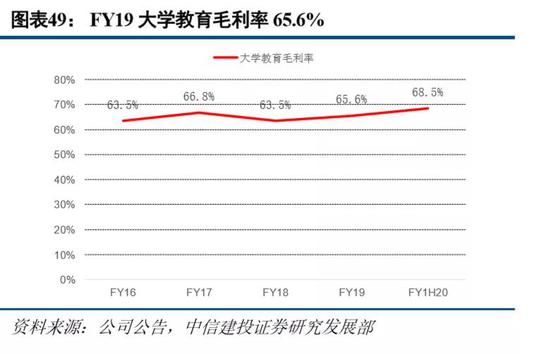 在线大学业务稳健增长,贡献现阶段主要毛利。FY19大学教育业务营业收入6.3亿元,营收占比68.7%,收入同比增长36.5%;FY1H20大学教育营收3.6亿元,同比增长5.5%。FY19大学教育业务毛利率65.6%,较去年同期增加2.1个百分点,毛利贡献达81.8%,FY1H20毛利率68.5%。公司于在线大学考试备考市场份额领先,2017年市占率达到8.2%。