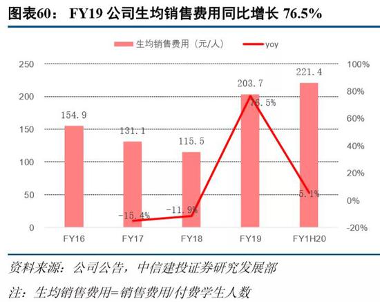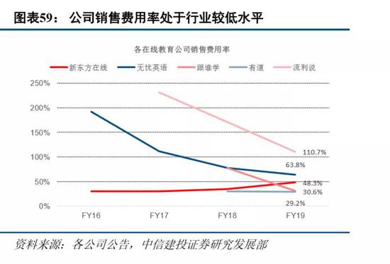 FY19公司销售费用率达48.3%,相比上年增加13.9个百分点;生均销售费用203.7元/人,同比增长76.5%。尽管销售费用率有所增长,但从同业公司看,新东方在线FY19 的48.3%的销售费用率仍处于行业较低水平。