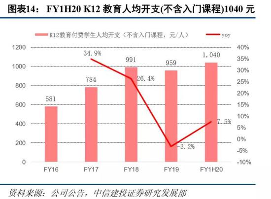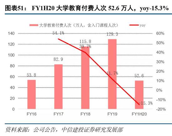 在线K12教育目前收入占比不高,但是未来最大看点。国内K12培训市场规模超过5000亿元,三四线城市市场规模超过2000亿元,是教培行业最大蛋糕之一,也是线上化潜力最大的板块。FY19公司K12教育收入1.59亿元,同比增长80.8%,收入占比17.3%。FY1H20公司K12教育收入1.28亿元,同比增长69.4%,收入占比提升至22.6%。FY1H20公司K12教育付费人次为75.5万,同增158.6%;人均付费价格为1040元,同增7.5%。