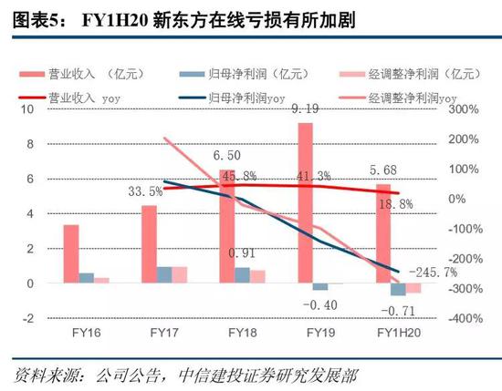 FY2019公司营收9.19亿元,同比增长41.3%,归母净利润-0.40亿元,经调整净利润(剔除非经常性损益、上市开支、股份酬金开支等后的净利润)为-28.9万元,略微亏损。FY1H20公司营收5.68亿元,同比增长18.8%,归母净利润-0.71亿元,去年同期为盈利0.49亿元,亏损加剧的原因主要是公司加大在线K12教育投入。FY1H20公司毛利率为55.9%,净利率为-15.4%,经调整净利率为-9.9%。