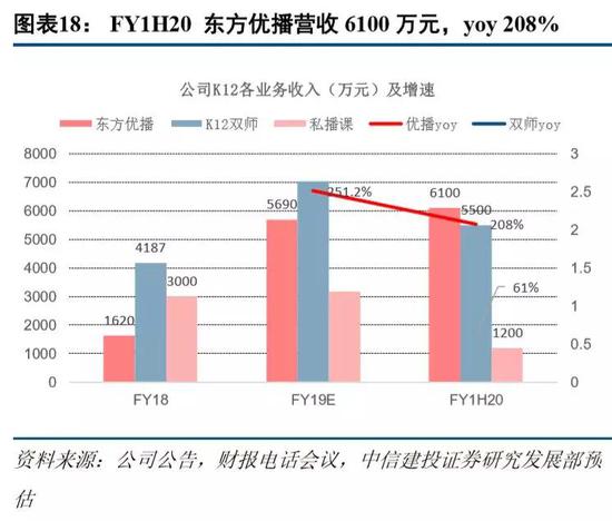 在线K12教育业务中,成立于2017年的东方优播是公司未来业务重点,其主打三四线城市K12单师小班线上直播课。FY19东方优播营收5690万元,收入同比大幅增长251.2%。FY1H20东方优播营收6100万元,同比增长208%,超过 K12双师直播课5500万元的收入(同增61%),成为公司K12教育第一大业务。