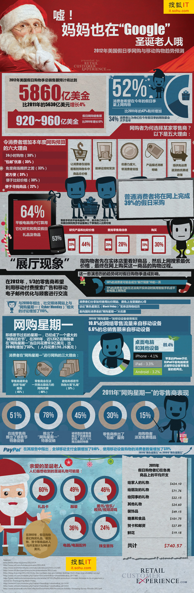 根据统计,2012年美国假日购物季总销售预计将达到5860亿美金,比2011年的5630亿美元增长了4%。其中假日网购的销售额为920-960亿美金,比2011年增长了12%。超过一半的消费者希望在假日季里进行网上购物,34%的消费者认为他们会增加今年的网购预算。