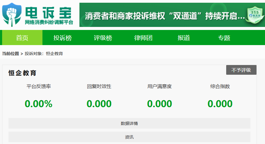 2025年至今,“电诉宝”受理投诉中涉及的数字教育领域用户有效投诉显示(依据投诉量排行),“恒企教育”排名第15位。最新评级为“不予评级”。除此之外,其他被投诉的类似平台还有:中安建培、一只船教育、尚德机构、帮考网、赛优教育、嗨学网、常青藤爸爸、潭州教育、帮考教育、沪江网校、正保会计网校、网易云课堂、VIPKID、恒企教育、英语流利说、环球网校、小叶子陪练、深海教育、聚力成师教育、中公教育、中职通、高教通、明世在线、阿卡索外教网、掌门1对1、众趣教育、腾讯课堂、菲尔莱。