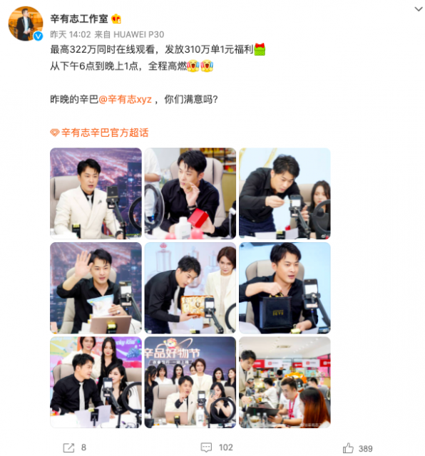 (网经社讯)7月31日,辛巴辛有志开启了“辛品好物节”专场直播,这场“衣食住行,一站上线”的直播涵盖了个护、美妆、数码电器、饰品、鞋包等多品类30余款产品,实现销售额超6.7亿元。