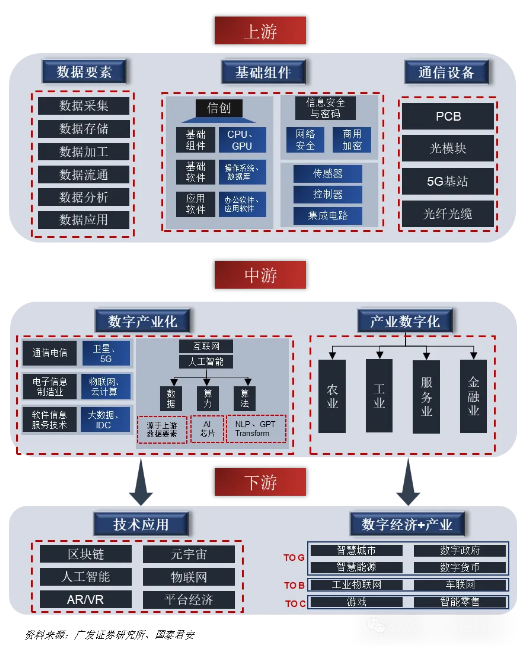 数字经济产业链的上层对应着数据价值化以及数字产业化中的基础电信部分(即数字经济的基础设施,包括软硬件等)。作为整个数字经济产业链的核心,数据要素是整个数字经济产业链循环的基础,而包含数字经济基础设施在内的信创产业则是推动产业链数字化程度不断提升的关键所在,两者是构建数字经济上层基础的关键。