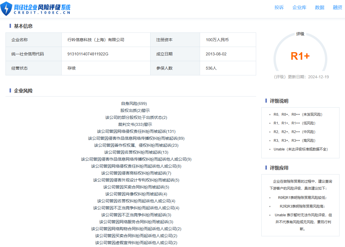 据网经社“企业风险评级系统”(CREDIT.100EC.CN)显示,“小红书”所属行吟信息科技(上海)有限公司的风险评级为R1+,公司目前所处低风险。
