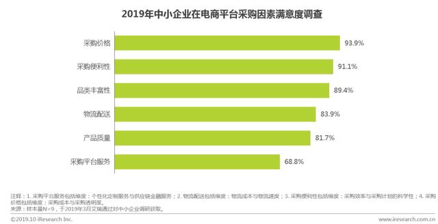 在中小企业电商化采购满意度调研中发现,中小企业最满意的是价格,消除中间商赚差价这个环节做得很好。依次是采购便利性、品类丰富性,其中物流配送、产品质量和采购平台服务位列后三名,采购平台服务排名最末,说明服务的客户对B2B销售环节的能力已经不再质疑,但除了一系列销售服务之外还有没有更新更好的服务给到他们,是一个新的挑战。